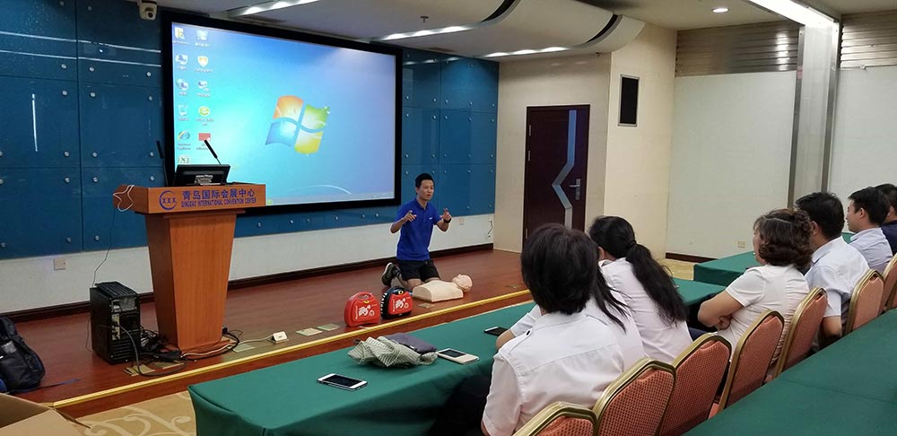 为有效解决公共场所发生人员心脏骤停时的生命急救问题,今年青岛市在机场、客运车站、港口码头、场馆、旅游景区等人员密集场所设置60台自动体外除颤仪(AED)。按照统一工作安排,此次在会展中心1、2、3号馆分别安装了3台仪器,安装完毕后,工作人员对中心员工做了简短的培训,讲解了常用医疗急救知识,介绍了仪器的使用原理、操作流程以及后期设备维护等工作,并指导中心员工实际操作使用设备。